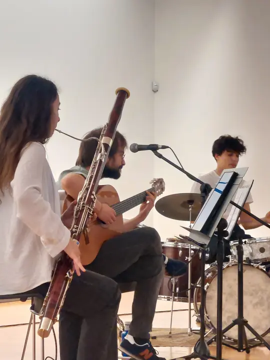 Tres músicos vigueses, cómplices habituales en el escenario, Juan Arca (voz y guitarra), Celia Matamoro (fagot) y David Puime (batería), inundaron el espacio museístico con ritmos brasileiros en un concierto dinámico que resonó entre las obras de la exposición.