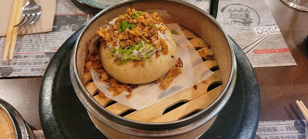 Para iniciar nuestra velada, nos decantamos por un “baozi de boletus” para compartir. Un pan bao al vapor relleno de boletus y shitake con mayonesa de trufa.