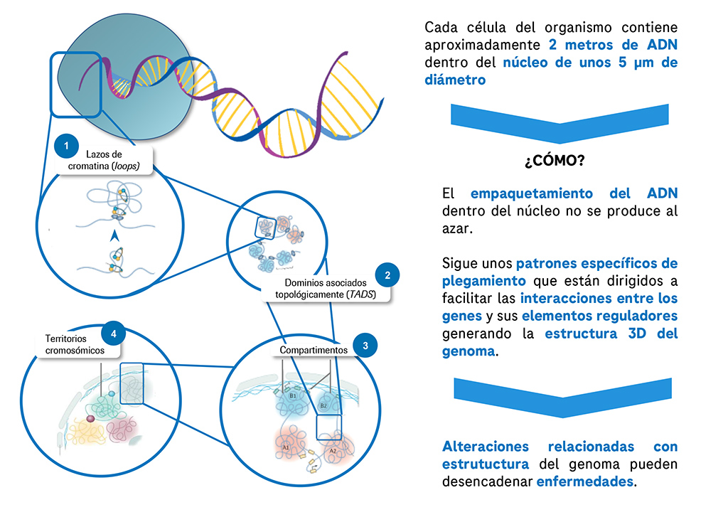 El empaquetamiento del ADN dentro del núcleo no se produce al azar, sino que sigue unos patrones específicos de plegamiento que están dirigidos a facilitar las interacciones de los genes y sus elementos reguladores generando la estructura 3D del genoma. Mediante el estudio del Nucleoma 4D, es posible conocer los cambios que se producen en dicha estructura tridimensional a lo largo del tiempo y así saber cuáles son las implicaciones y consecuencias que esto podría tener en las funciones del genoma, el desarrollo de enfermedades y su evolución.