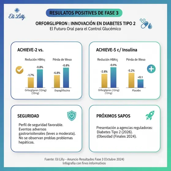 ACHIEVE-5 (en combinación con Insulina): Este estudio comparó orforglipron con placebo en adultos con control glucémico inadecuado que ya recibían insulina glargina.