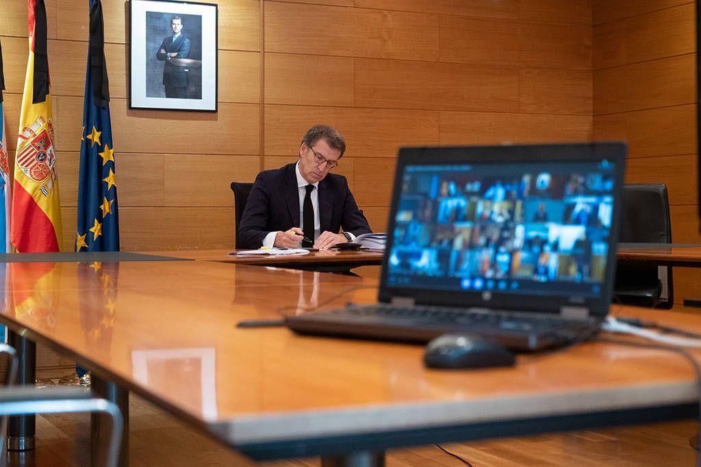 El presidente de la Xunta aprovechó la reunión para trasladar al Gobierno las dudas del pequeño comercio en esta fase 1, sobre cómo cumplir el deber de establecer sistemas que permitan el recuento y control del aforo; así como la preocupación por el hecho de que se permitan rebajas y promociones veía web y no presencialmente.