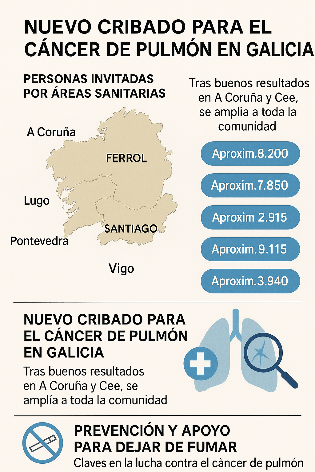 La Xunta de Galicia avanza en la lucha contra el cáncer de pulmón con la ampliación a toda la comunidad del programa piloto de cribaje LUNG-GAL, coordinado por la Consellería de Sanidade a través de la Dirección Xeral de Saúde Pública. La decisión llega tras los resultados obtenidos en el área sanitaria de A Coruña y Cee, donde la iniciativa comenzó el pasado año y permitió detectar tres de cinco casos de cáncer de pulmón en estadios precoces, lo que representa el 60%.