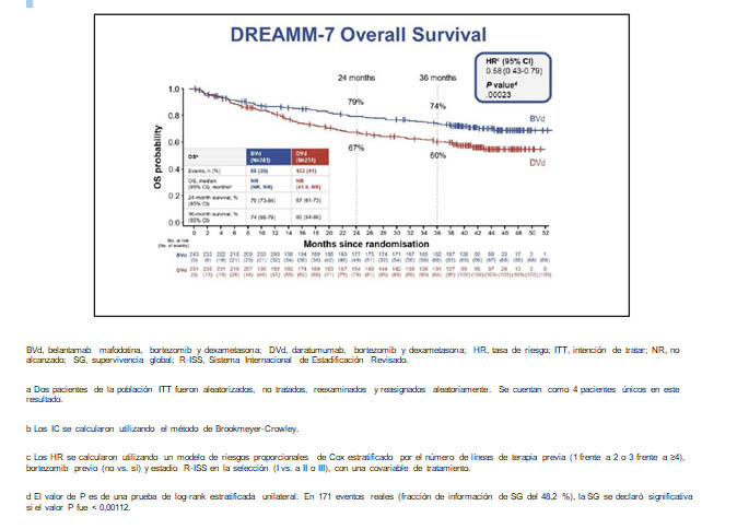 El estudio, llamado DREAMM-7, comparó la eficacia de BLENREP combinado con otros medicamentos estándar (bortezomib y dexametasona) frente a otro tratamiento estándar (daratumumab con bortezomib y dexametasona) en pacientes con mieloma múltiple que habían recaído por primera vez.