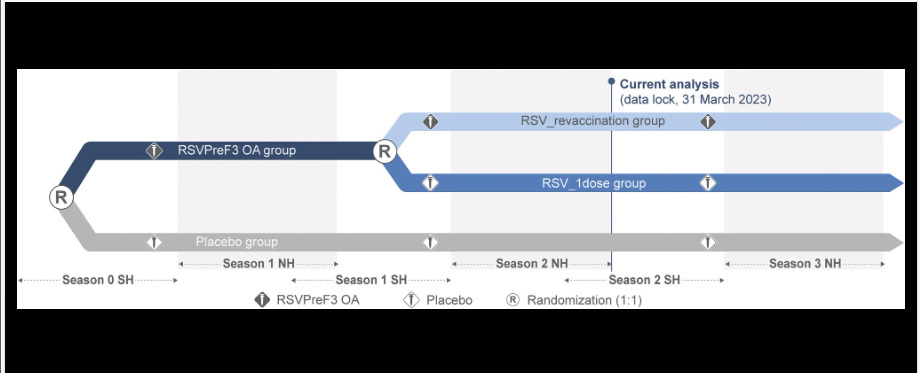 Es un estudio clínico de fase III multinacional, aleatorizado, controlado con placebo y ciego para demostrar la eficacia de una dosis única de la vacuna adyuvada de GSK frente al VRS en adultos de 60 años o más durante 3 años y siguiendo un esquema de revacunación anual. Se reclutaron aproximadamente 25.000 participantes de 17 países, entre ellos España. El objetivo principal del estudio era comprobar la eficacia frente a la VRS-LRTD después de una temporada de VRS. Los resultados iniciales se publicaron en la revista científica New England Journal of Medicine en febrero de 20232.