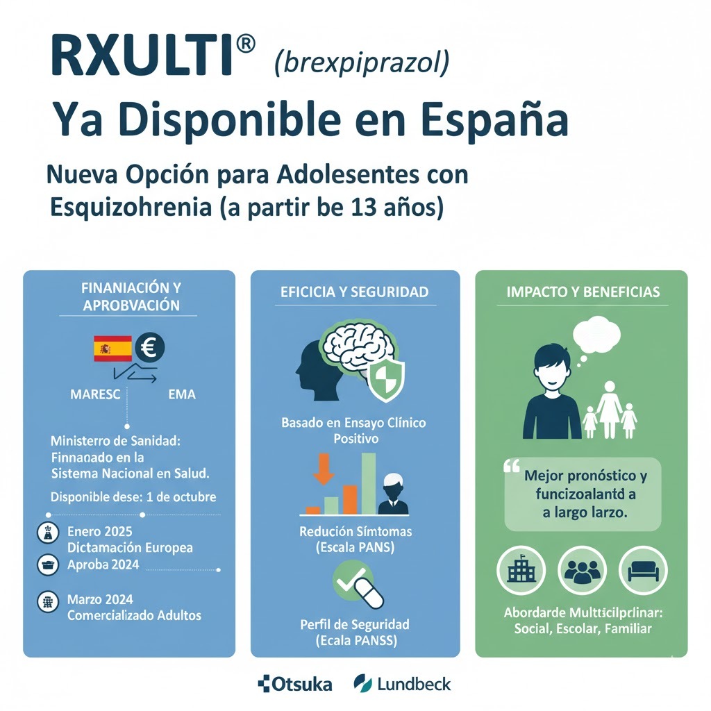 La decisión llega tras el acuerdo de la Comisión Interministerial de Precios de los Medicamentos (CIPM) del Ministerio de Sanidad. Esta financiación pública se basa en el dictamen positivo de la Agencia Europea de Medicamentos (EMA) de enero de 2025 y su posterior aprobación por la Comisión Europea en marzo de este año. RXULTI®, que ya estaba aprobado en la Unión Europea desde 2018 para adultos con esquizofrenia y comercializado en España desde marzo de 2024, amplía así su indicación.