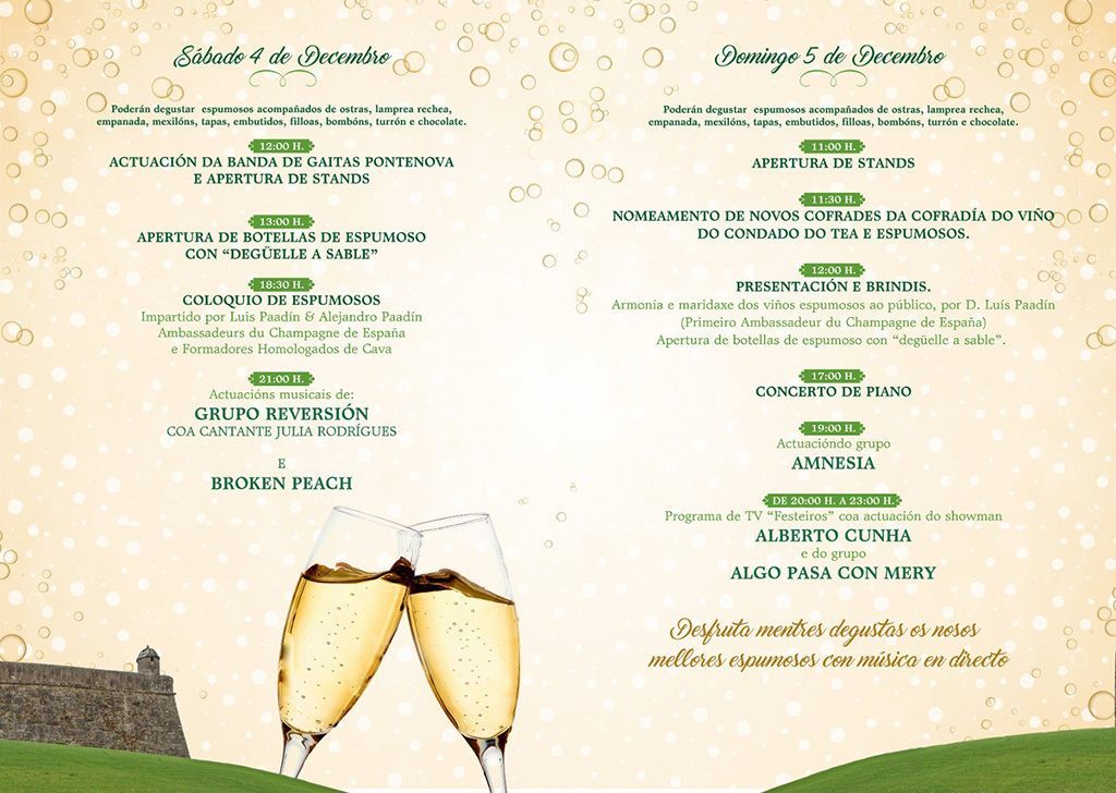 A 7ª Festa do Viño Espumoso en Salvaterra de Miño volve a se celebrar o próximos 4 e 5 de decembro en dúas xornadas para degustar e desfrutar dos espumosos DO Rías Baixas. O domingo 5 vai ter lugar, na carpa, o nomeamento de novos confrades da Confraría do Viño do Condado do Tea e Espumosos, ás 11.30 horas.