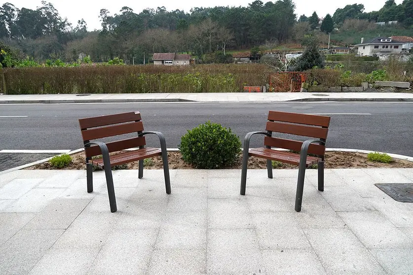 Inicialmente estaba prevista a colocación de bancos pero, tendo en conta a actual situación de pandemia, foron substituídos por 12 cadeiras individuais. Do mesmo xeito foron acondicionadas as xardineiras ao longo da beirarrúa e plantáronse 6 arbores de porte medio. Coma medida de seguridade nas zonas onde existen desniveis foron instaladas varandas de aceiro inoxidable.