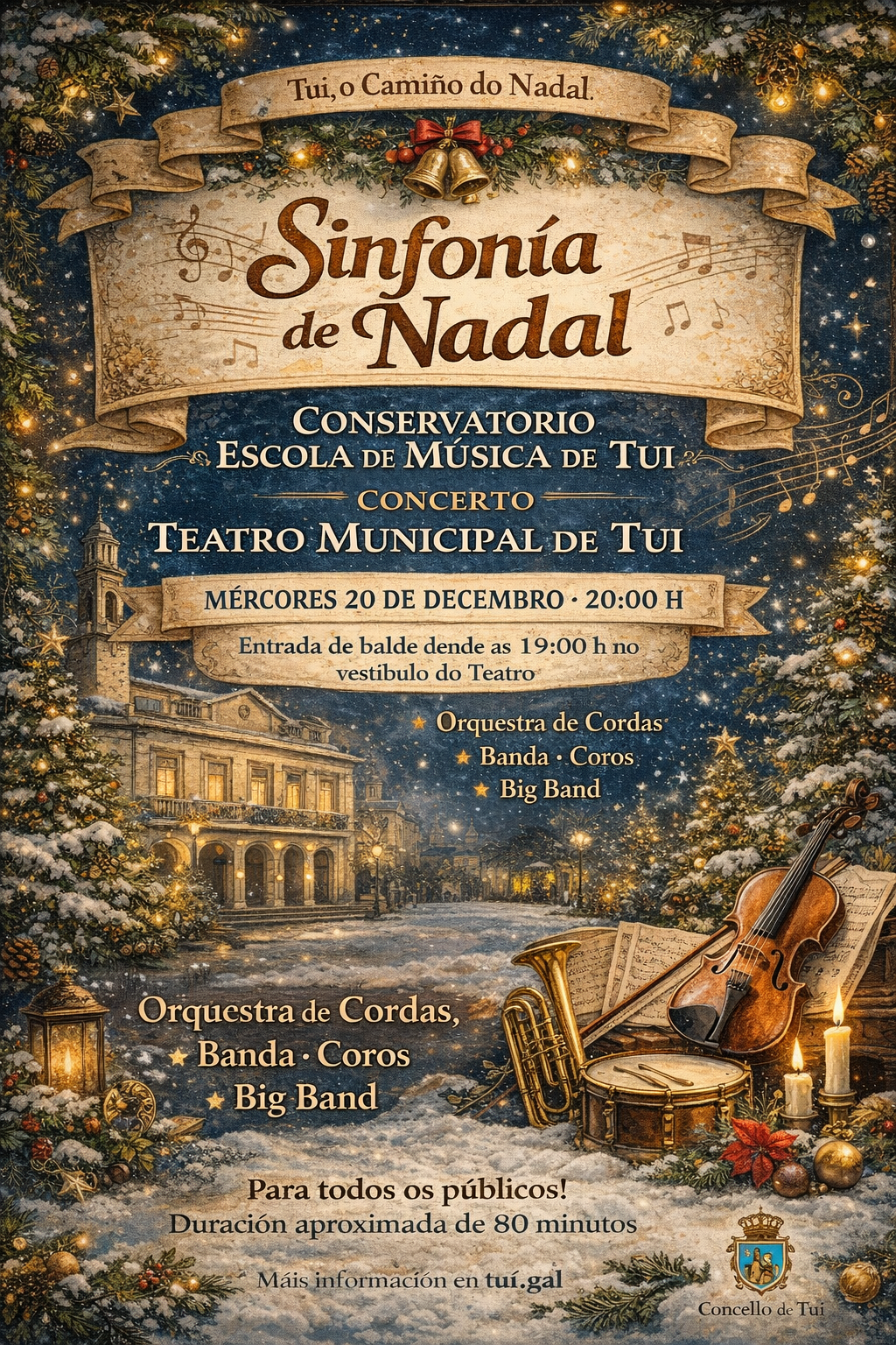 O Teatro Municipal de Tui acollerá mañá, ás 20.00 horas, o concerto “Sinfonía de Nadal”, protagonizado polo alumnado do Conservatorio e da Escola de Música de Tui. A actuación forma parte da programación “Tui, o Camiño do Nadal”, organizada polo Concello de Tui.