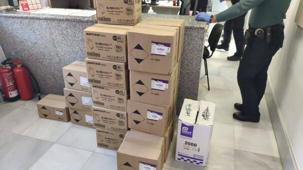 luvas, 124,5 litros de alcohol e 510 mascarillas. O material incautado foi