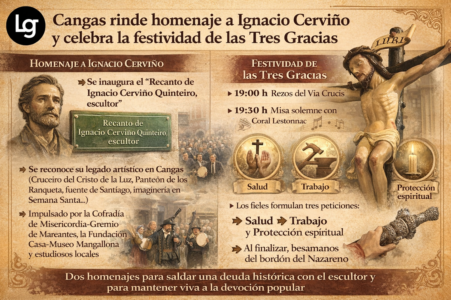 Así, entre el reconocimiento a su patrimonio artístico y la vivencia de sus tradiciones religiosas, Cangas reafirma su identidad colectiva, manteniendo vivo el legado de figuras como Ignacio Cerviño y el fervor popular que define su Semana Santa.
