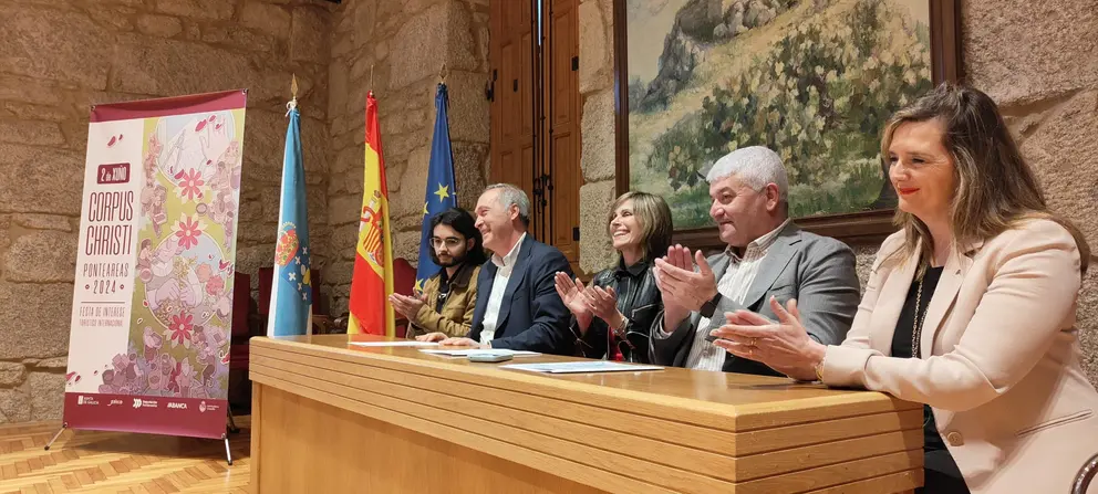 O Concello presentou o cartel que anuncia a celebración do Corpus Christi para este ano 2024. Trátase dun deseño do ponteareán Sergio de Arcos no que valoriza o traballo de debullar a flor así como a unión da veciñanza para confeccionar as famosas alfombras da vila. A proposta é a gañadora do concurso que celebrou a administración local.
