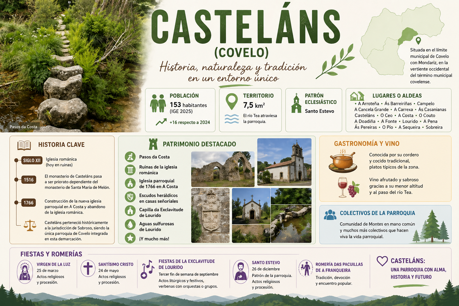 La parroquia de Casteláns, situada en el límite municipal de Covelo con Mondariz, en la vertiente occidental del término covelense, es uno de los enclaves con mayor riqueza histórica y cultural de la zona.