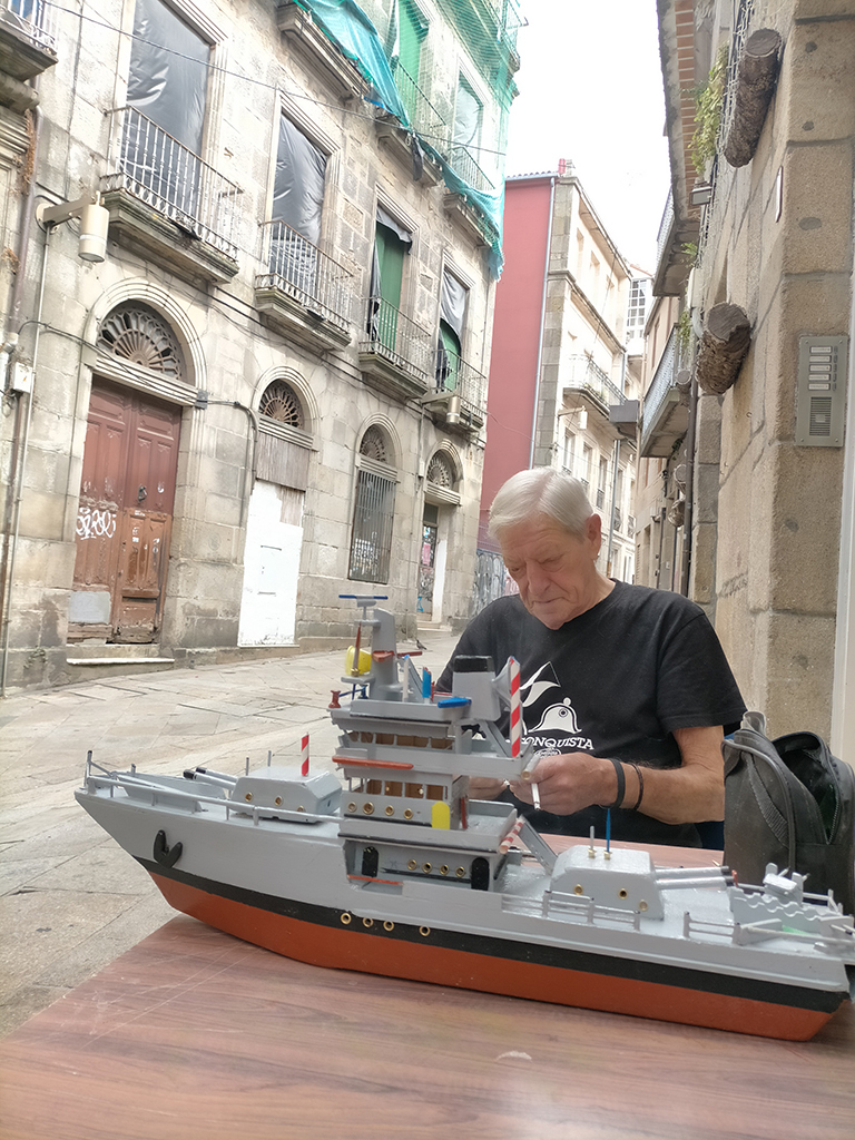 Él construye barcos artesanales, manualmente, con aglomerado fino de pasta y pegamento normal, una afición que inició hace 15 años en Coia y que, desde entonces, no ha abandonado.