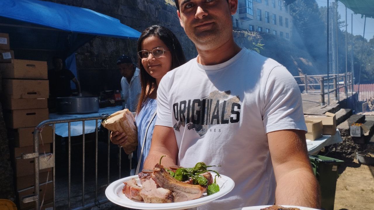 A eso de las dos de la tarde, había muchos coches en las proximidades de la plaza del Concello y la carballeira estaba a tope. Un gran palco y grandes conjuntos musicales animaron la degustación del tradicional churrasco. Tras la compra del ticket, la cola para recoger los platos duraba una hora. En otra parte, se recogía el vino, y luego se buscaba un lugar en las mesas dispuestas en largas filas. En el mismo recinto había dulces artesanos y otros puestos de venta.
