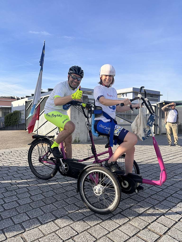 Luis López participa na carreira Vig-Bay acompañando en bicicleta aos usuarios de Discamino