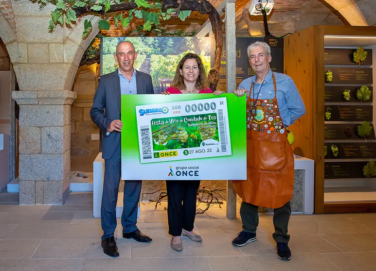 El director de la ONCE en Vigo, Roberto Gaspar Conde, la alcaldesa-presidenta del Concello de Salvaterra de Miño, Marta Valcárcel Gómez, y el presidente de la Cofradía del Vino del Condado del Tea y Espumosos, Antonio Alén, han presentado este cupón, en la sede del Museo da Ciencia do Viño de este Concello.