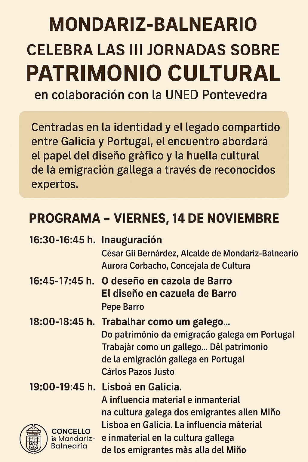 En consonancia con estos principios, los municipios tienen entre sus competencias la protección y gestión del patrimonio histórico, así como la promoción de la cultura. Por ello, el Grupo de Gobierno de Mondariz-Balneario considera de especial interés fomentar el debate y la difusión en torno a estas cuestiones. En ese marco se celebran las III Jornadas sobre el Patrimonio Cultural, organizadas en colaboración con la UNED Pontevedra, que este año centran su atención en aspectos de la cultura vinculados a la identidad.