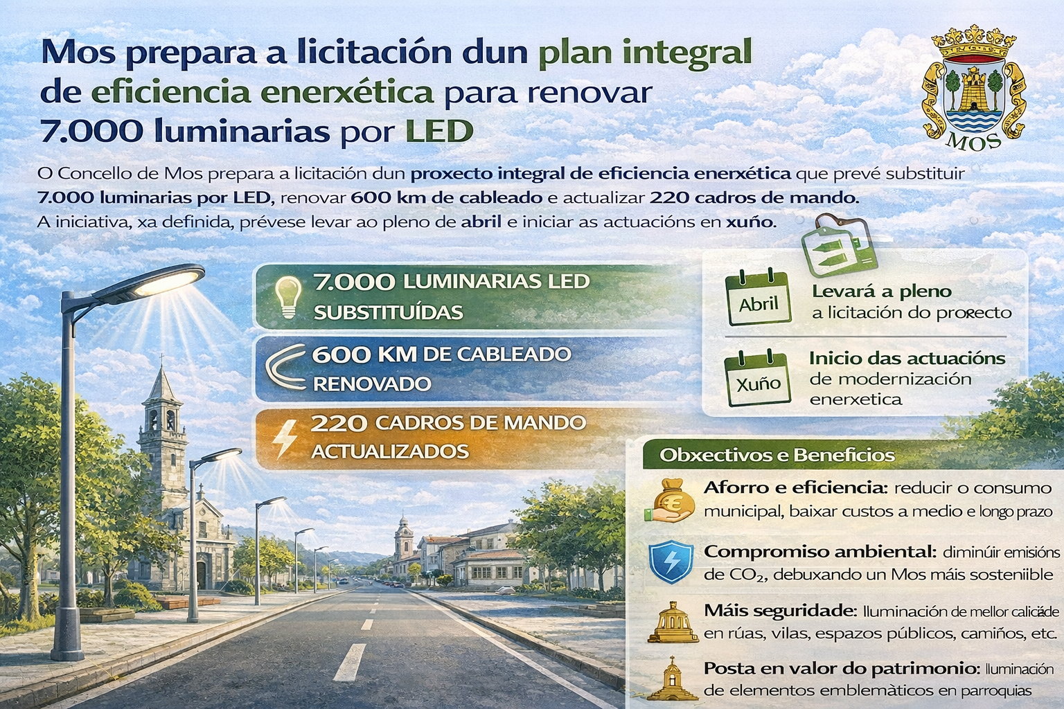O Concello de Mos avanza na posta en marcha dun proxecto integral de eficiencia enerxética e modernización da iluminación pública, unha actuación de grande alcance coa que pretende renovar infraestruturas municipais, mellorar a calidade da luz e reforzar o compromiso coa sustentabilidade ambiental.