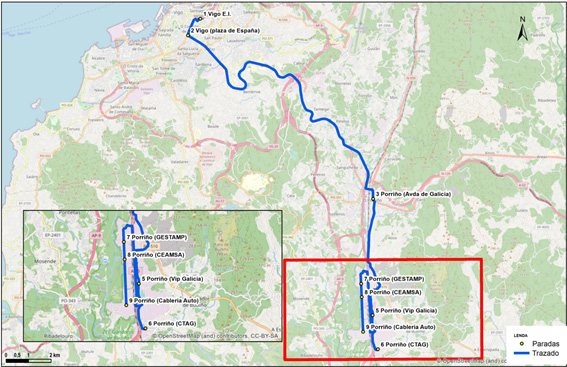 O itinerario comprende 9 paradas, das cales 6, nos polígonos industriais, son de nova creación. A relación de puntos de paso inclúe 2 en Vigo e 7 no Porriño por esta orde: Vigo estación intermodal, Vigo (praza de España), O Porriño (avenida de Galicia), O Porriño (Imprenta Paz), O Porriño (Vip Galicia), O Porriño (CTAG), O Porriño (GESTAMP), O Porriño (CEAMSA), O Porriño (Cableria Auto).