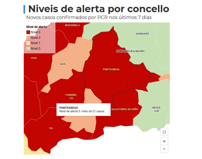 O Concello de Ponteareas vén de reunir de urxencia o seu comité de seguimento da COVID-19, tras aumentar novamente a incidencia da pandemia na localidade. Segundo os datos oficiais publicados polo Servizo Galego de Saúde, Ponteareas sitúase en nivel de alerta vermella, ao superar nos últimos sete días os 21 novos casos positivos confirmados por PCR.