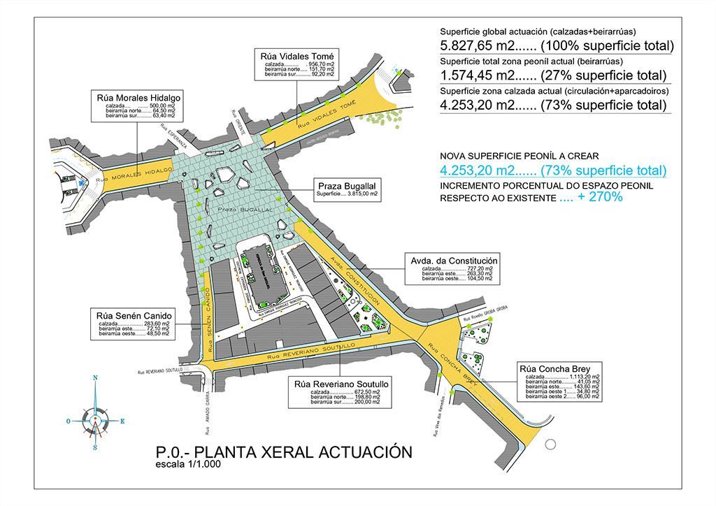 Os obxectivos do proxecto son recuperar o espazo para as persoas, para a súa mobilidade e para a estancia social nunha superficie actualmente monopolizada polo vehículo a motor, que ocupa o 73% da superficie total dos 5.827 m2 que representan as seis rúas. O goberno local lembra que, segundo os datos do Plan de Mobilidade Urbana Sostíbel (PMUS), o tránsito de persoas no itinerario de rúa Constitución a Praza de Bugallal e Vidales Tomé acada picos de case 1.000 persoas nunha hora, que se desprazan por beirarrúas estreitas, mentres que o tráfico que viña entrando na Praza de Bugallal por tres rúas diferentes acadaba picos de case 700 coches nunha hora.