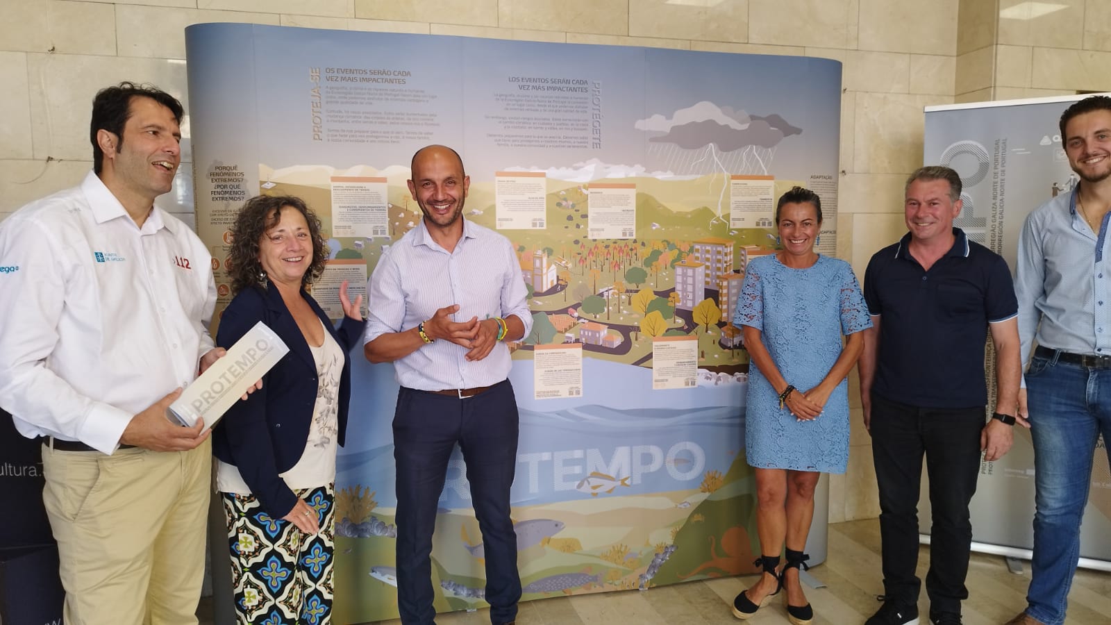 O alcalde do Porriño, Alejandro Lorenzo, xunto coa Directora de Calidade Ambiental, Sagrario Pérez, e o xerente da Axencia Galega de Emerxencias (AXEGA), Marcos Araújo, presentaron esta mañá a mostra enmarcada dentro do proxecto de Protección Transfronteiriza de Emerxencias dirixido á poboación da Eurorrexión Galicia-Norte de Portugal (PROTEMPO). As exhibicións teñen como obxectivo promover a concienciación sobre o cambio climático e a prevención e xestión de riscos, así como aumentar a resiliencia territorial ante os perigos naturais nas zonas de fronteira.
