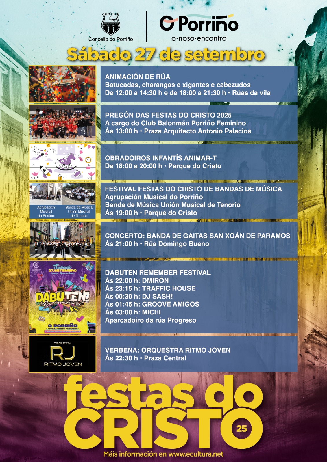 O sábado, o acto central será a lectura do pregón ás 13:00 horas na Praza Arquitecto Antonio Palacios, a cargo do equipo feminino do Club Balonmán Porriño, subcampión de Europa. A xornada incluirá animación de rúa con batucadas e a música das bandas musicais, rematando a noite coa verbena da Orquestra Ritmo Joven.