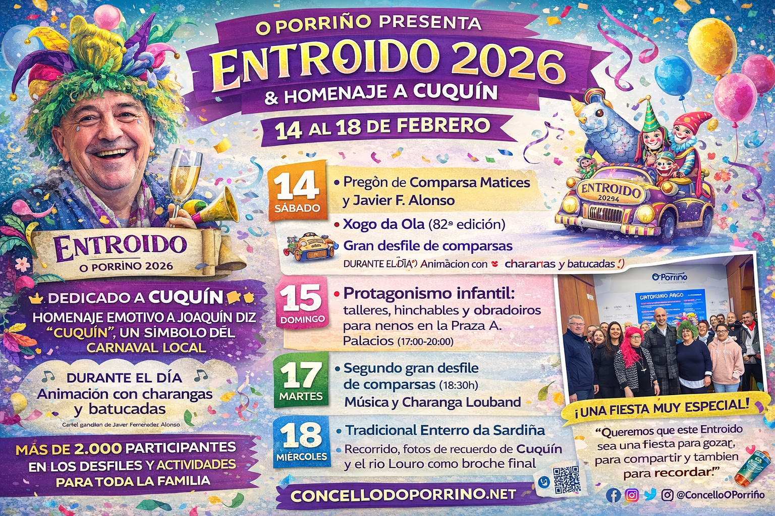 Durante la presentación, el alcalde Alejandro Lorenzo destacó que “el Entroido define perfectamente el espíritu de nuestro pueblo: una fiesta en la calle, en comunidad y con mucha participación vecinal”. El regidor añadió que este año se quiso incorporar “un componente emotivo y humano” para recordar a Cuquín, “una persona que forma parte de la memoria colectiva de O Porriño y que estará muy presente a lo largo de toda la programación”.