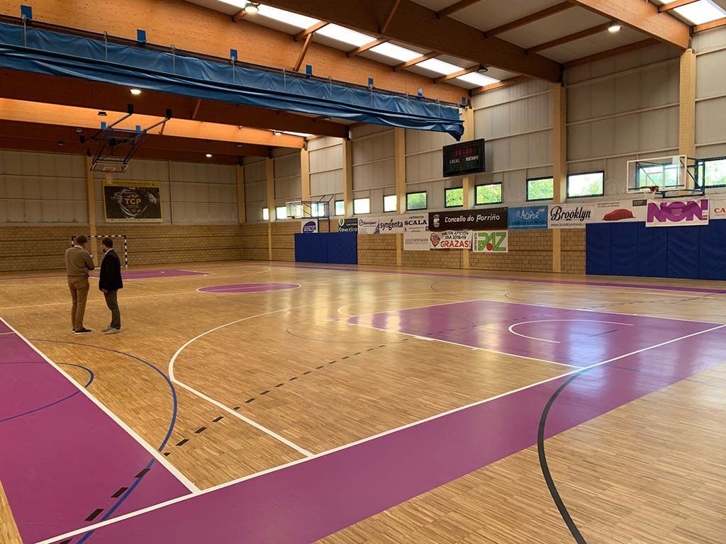 A pista 2 do Polideportivo Municipal, unha vez rematadas as obras de lixado, arranxo e colocación da nova superficie de madeira para concluír a reparación dos danos ocasionados polas inundacións do 1 de xuño, estrea nova imaxe co pintado das liñas da cancha en cor morada.