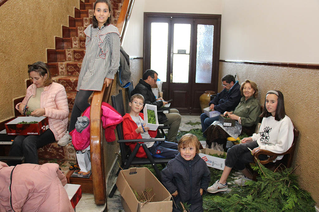 Ahora mismo llevan ya dos semanas trabajando, la mayoría de 4.30 a 9 de la noche. Principalmente preparan la acacia o mimosa para hacer lo que podríamos llamar el relleno. Este material vegetal lo suministra el Concello de Ponteareas. De hecho, la alcaldesa tiene el empeño este año en rellenar con este verde el espacio entre alfombra y alfombra para dar una línea de continuidad y unidad a todo el recorrido por las calles ponteareanas que discurre la procesión.