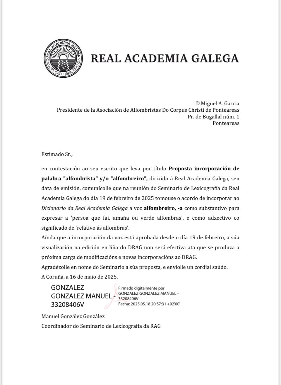 Unha demanda histórica dos alfombristas galegos vén de ser atendida pola Real Academia Galega (RAG). A institución acordou incorporar ao seu dicionario os termos "alfombreiro" e "alfombreira" para designar ás persoas que confeccionan alfombras de flores, unha práctica arraigada en toda Galicia e da que as creacións de Ponteareas son un referente a nivel internacional.