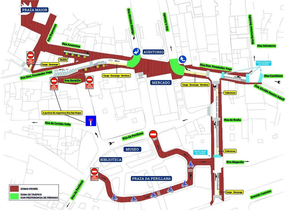 O vindeiro luns darán comezo os traballos de pintado e sinalización de diferentes rúas no entorno do Mercado Municipal. As actuacións forman parte do plan de reordenación dos espazos peonís e do tráfico nas rúas A Braña, Fernández Vega, Perillana, Esperanza, República Arxentina, Morales Hidalgo, A Estrada, Castiñeira, Virxe da Luz e A Minada.