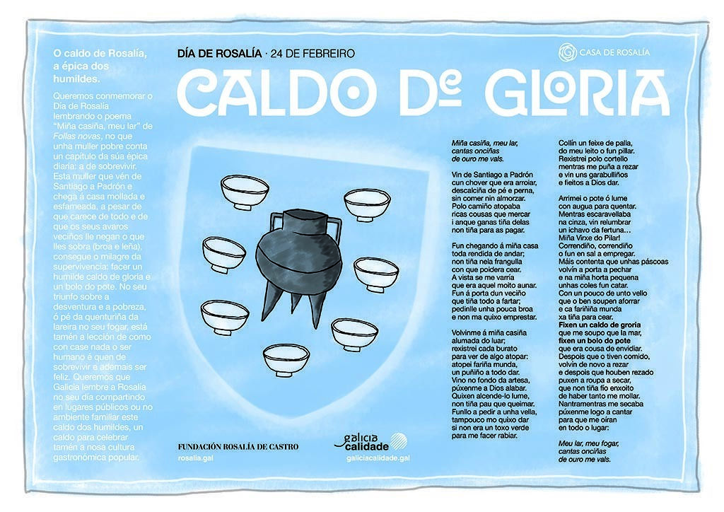 Por outra banda, a Concellería de Cultura do Concello de Tui súmase, como en anos pasados, á iniciativa impulsada dende a Fundación Rosalía de Castro, denominada o "Caldo de gloria". Unha iniciativa que xorde a partir do poema “Miña casiña, meu lar” (Follas novas, 1880), no que unha muller pobre que chega á casa mollada e esfameada, a pesar de que carece de todo, consegue o milagre da supervivencia: facer un humilde caldo de gloria e un bolo do pote, quentarse ó pé do lume e ser feliz.