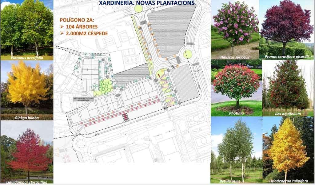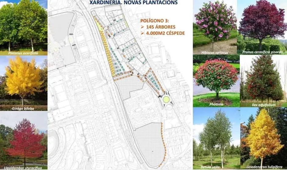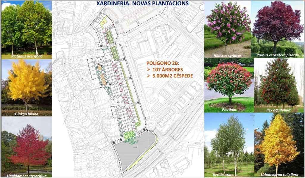 En concreto, está proxectada a plantación de preto de 600 árbores de diferentes especies, a maioría delas autóctonas e seleccionadas polo seu carácter ornamental. De feito, estes exemplares colocaranse non só en zonas verdes e na alameda prevista no proxecto, senón tamén adornando as rúas principais e secundarias, así como no vieiro que actuará como eixo vertebrador de todo o ámbito. Entre as especies de nova plantación haberá plataneiros, bidueiros, hibiscos, ameixeiras de xardín ou acivros.