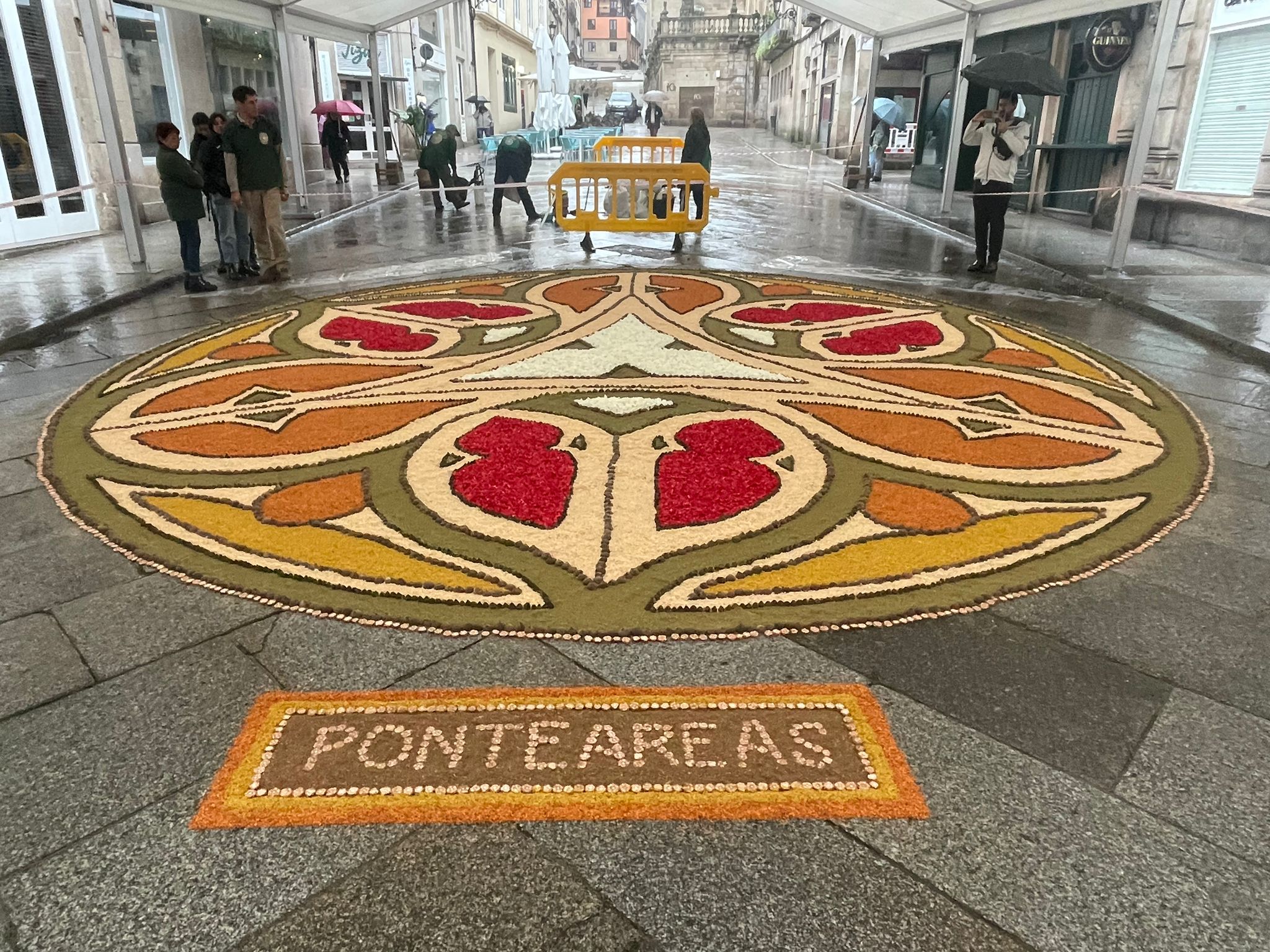 La alfombra reproduce el rosetón de la Catedral de Ourense, pues la Asociación de Alfombristas do Corpus Christi de Ponteareas quiere valorizar la Catedral de Ourense que forma parte de la historia viva de la ciudad y es uno de los grandes templos románicos de España,