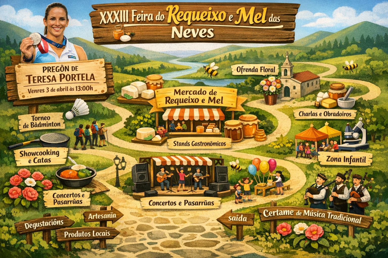 A padexeira canguesa, considerada unha das grandes figuras do deporte galego e español, pronunciará o pregón o venres 3 de abril ás 13.00 horas, coincidindo coa xornada central da feira. O evento reunirá durante esa fin de semana gastronomía, música, tradición e actividades para todos os públicos arredor dos dous produtos máis representativos da identidade local: o requeixo e o mel.