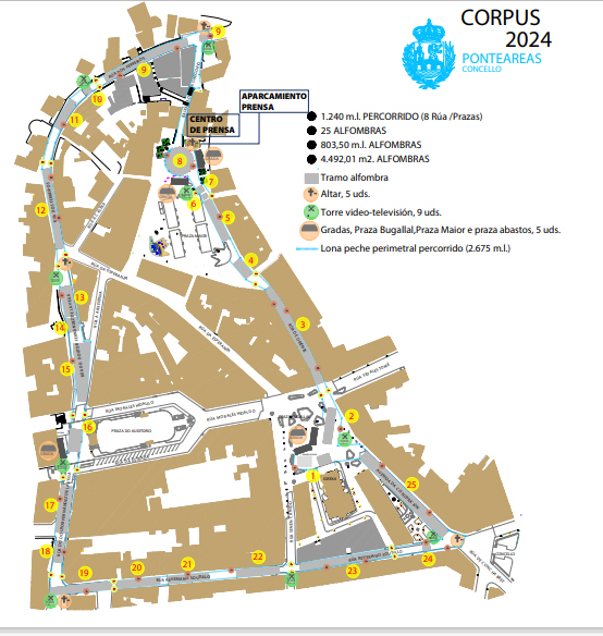 Entre las 8 lugares, en su mayoría calles y las plazas las 25 alfombras van a conformar un recorrido de 1.240 metros, 803,5 de alfombras, que suponen 4.492,01 metros cuadrados de tramo alfombrados. Se dispondrán 5 altares donde se detendrá el Santísimo y se procederá a la adoración y bendición. Los medios de comunicación dispondrán de 9 torres para vídeo y televisión. El concello ponteareán también ha dispuesto de gradas en la praza de Bugallal, praza Maior y praza de abastos. Una lona de peche perimetral rodeará el recorrido alfombrado con una longitud de 2.675 metros de longitud.