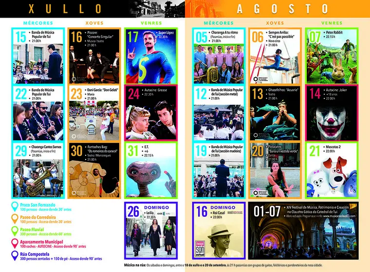O cinema estará tamén presente nesta programación con dúas propostas. No Paseo Fluvial, con capacidade para 300 espectadores proxectarase “Súpez López” (17 de xullo), “E.T.” (31 de xullo), “Peter Rabbit” (7 de agosto) e “Mascotas” (21 de agosto). Coma novidade haberá autocine no aparcamento municipal na traseira da Área Panorámica con capacidade para 100 coches poderá visionarse “Grease” e “Jocker” os venres 24 de xullo e 14 de agosto, respectivamente. Será nunha pantalla de 150 m2 con sistema de son a través da sintonización da frecuencia FM que se indicará en cada proxección.