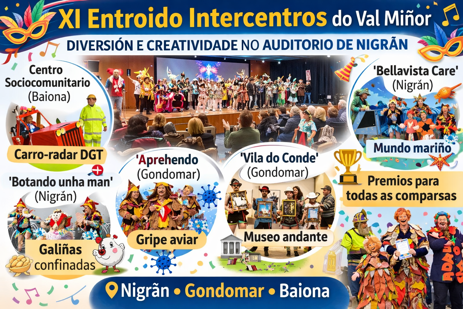 O Concello de Nigrán celebrou este mediodía no Auditorio Municipal o XI Entroido Intercentros do Val Miñor, unha cita xa consolidada no calendario festivo da comarca e protagonizada polos usuarios dos diferentes centros de día.