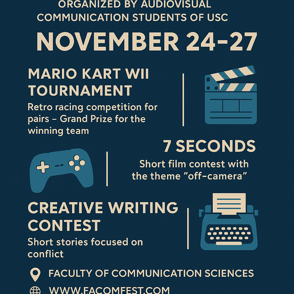 El certamen, que se celebrará en la Facultad de Ciencias de la Comunicación, combinará coloquios, conferencias y actividades que serán anunciadas en las próximas semanas, junto con las tres primeras iniciativas ya abiertas al público: el Torneo Mario Kart Wii, el concurso de cortometrajes “7 Segundos” y el concurso de Escritura Creativa.