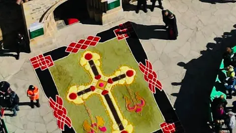 La ‘Asociación de Alfombristas do Corpus Christi de Ponteareas’, para el inicio del año jubilar Lebaniego de 2023, ha confeccionado una alfombra floral a la que se denominó ‘lignun crucis, el faro del camino’ delante de la Puerta del Perdón, con motivo de su apertura y la celebración de Santo Toribio e inicio del año jubilar lebaniego 2023-2024. La alfombra responde al modelo de las que se hacen en Ponteareas en la fiesta del Corpus Christi.
