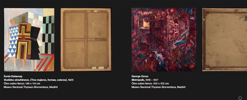 En el apartado Anverso / Reverso, una galería permite explorar visualmente diferentes obras por sus anversos y reversos: Metrópolis (1916-1917) de George Grosz, en cuya trasera el propio artista dibujó una visión constelar de estrellas que se conservan junto al número de registro que se impuso a esta pintura cuando formó parte de la Exposición de Arte Degenerado (1937); La Virgen de la aldea de Marc Chagall (1938-1942) o New York City 3 (inacabado) (1941) de Piet Mondrian comparten el haber sido terminadas en el lugar de destino, en este caso Nueva York, durante el exilio de ambos artistas.