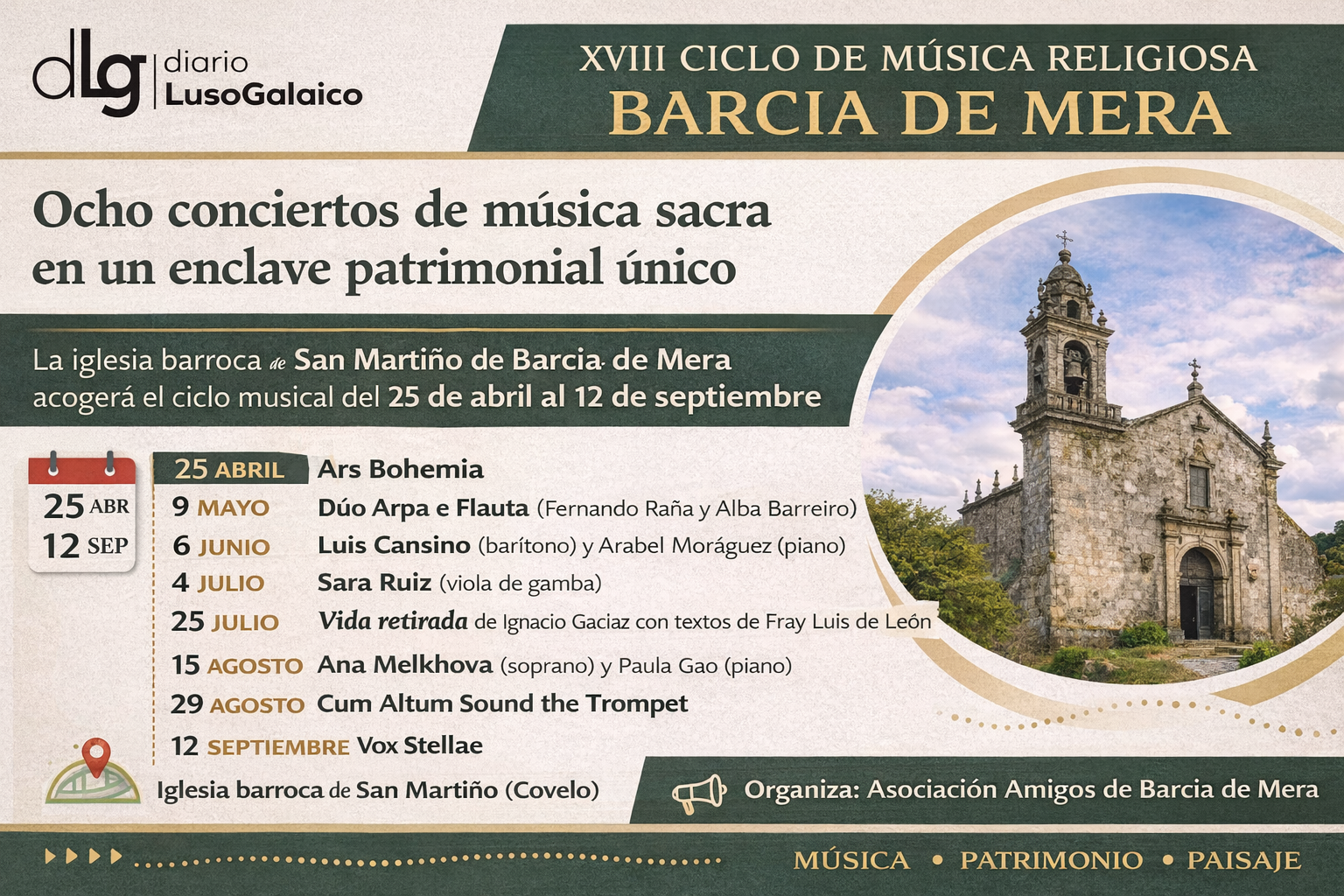 El ciclo de música religiosa Barcia de Mera regresa en su XVIII edición con una programación que llenará de música la iglesia barroca de San Martiño, en el municipio pontevedrés de Covelo, entre el 25 de abril y el 12 de septiembre.