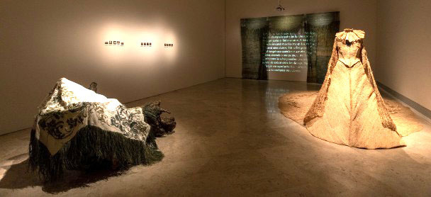 Memorias mestizas reúne un total de nueve obras, cinco de ellas instaladas en la sala de exposiciones de la primera planta, con acceso directo desde el hall del museo, y otras cuatro, realizadas para la ocasión, distribuidas en distintas salas de la colección permanente, en diálogo con pinturas de maestros antiguos como Rubens, Jan Davidsz. de Heem, Jacques Linard y Frans Hals. El material utilizado en las piezas, la rafia, se convierte en el hilo conductor de una historia que habla de las propias experiencias vitales de la artista como mujer mestiza - recuerdos de la infancia, fantasías, investigaciones históricas, viejos relatos ya mitificados...-, rescatando episodios de la historia colonial.