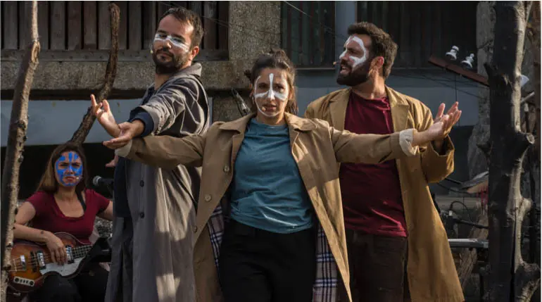 Até ao dia 1 de agosto, a companhia de teatro minhota vai percorrer os municípios de Valença e Monção, com atuações nos centros de cidade/vila e em seis aldeias. É a última oportunidade para ver FIM DE TARDE, um espetáculo encenado por Leonor Barata, cocriado pelos atores da companhia, e com uma forte componente musical, assegurada pela atuação ao vivo de Sara Yasmine e Afonso Passos. A cenografia e figurinos ficaram a cargo de Cristóvão Neto, que criou um ambiente distópico em palco. Em cena, três atores usam o humor para questionar a forma como contamos histórias e, com elas, nos construímos.
