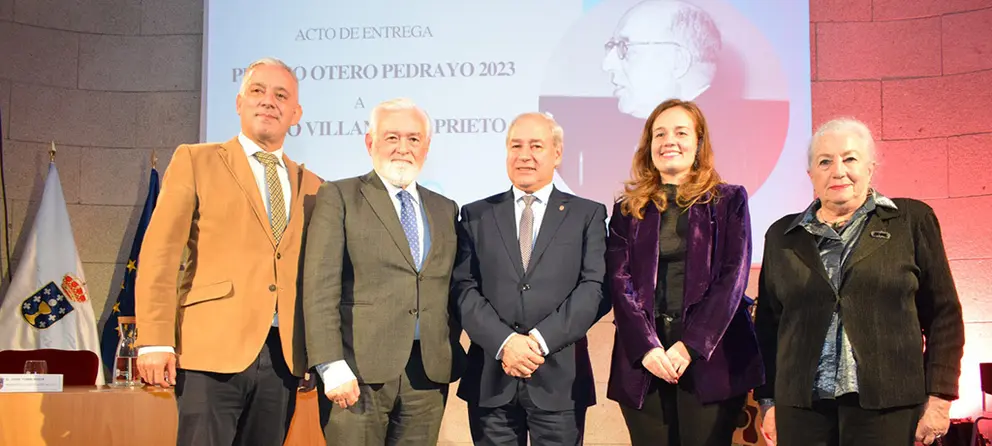 O Presidente da Deputación de Lugo, José Tomé Roca, entregoulle este mércores o Premio Otero Pedrayo a Darío Villanueva nun acto que acolleu o Salón de Actos do Pazo de San Marcos, ao que tamén asistiron a Deputada de Cultura, Patrimonio Histórico Artístico e Normalización Lingüística, Iria Castro, a Deputada de Muller e Igualdade, Marisol Morandeira, e o Deputado de Medio Ambiente, Carlos López.