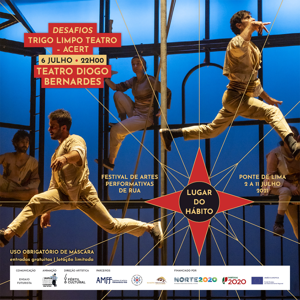 O espetáculo que estava programado, no âmbito do “Lugar do Hábito” – Festival de Artes Performativas de Rua, para o dia 6 de julho, terça, no Largo Fronteiro à Capela de S. João, pela Companhia Trigo Limpo Teatro – ACERT, denominado 'Desafios', irá ser transferido para o Teatro Diogo Bernardes, mantendo a mesma hora de apresentação, 22h00. Esta situação prende-se com a incerteza das condições climáticas que podem impedir a realização do espetáculo ao ar livre e a subsequente presença de público. Os bilhetes são gratuitos, mas obrigatórios, com lugares marcados, cumprindo o plano de contingência do TDB, pelo que devem ser levantados na bilheteira do mesmo, no período da manhã, entre as 9h30 e as 12h30 e no período da tarde, das 14h00 até às 17h30 e depois a partir das 20h30, uma hora e meia antes da realização do espetáculo.