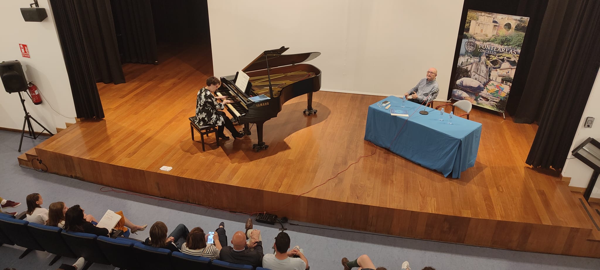 A pianista e pedagoga ponteareá Esther Sobral durante a actividade “Falando entre liñas”, un encontro cos estudantes do Conservatorio Municipal no que a compositora presentou os seus dous libros xunto co profesor do Conservatorio Superior da Coruña José Manuel Yañez.