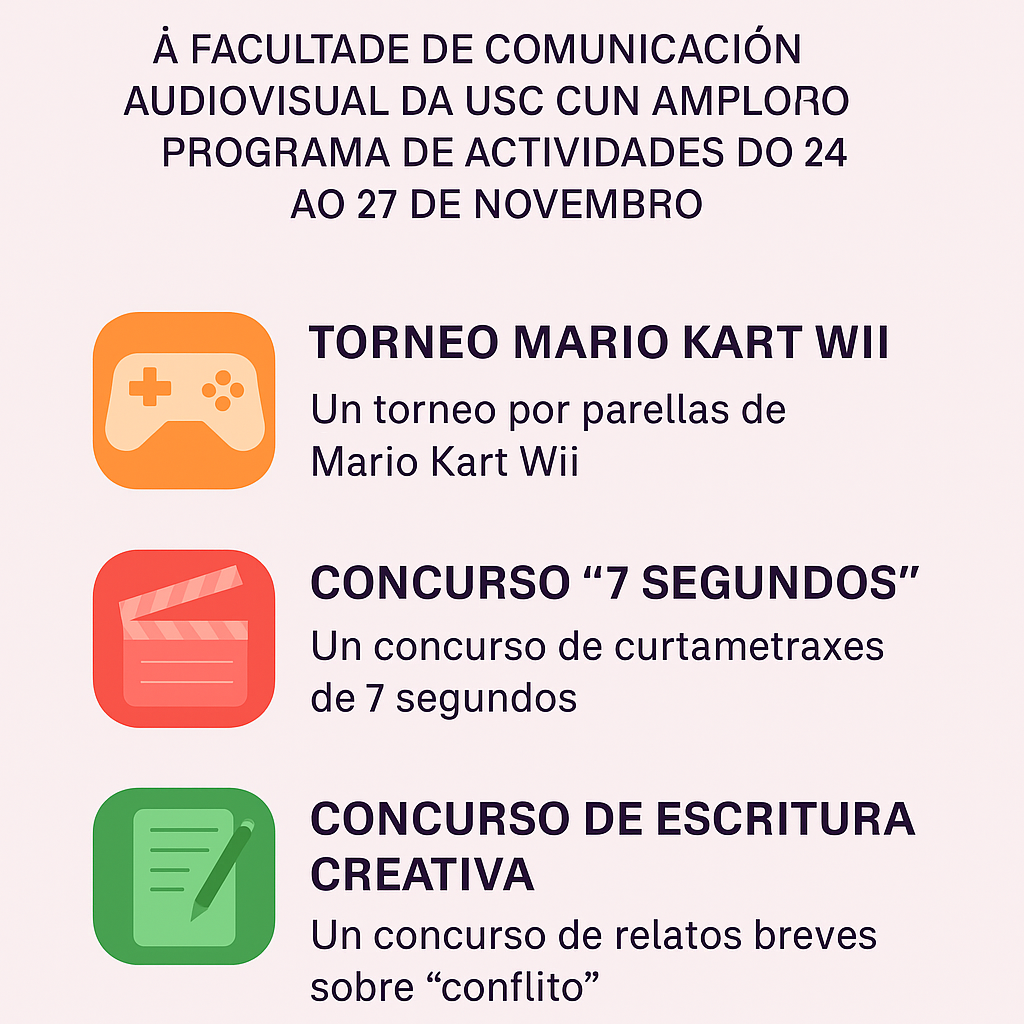 O estudantado de 4º de Comunicación Audiovisual da Universidade de Santiago de Compostela prepara unha nova edición do Facom Fest, que terá lugar do 24 ao 27 de novembro, recuperando así un encontro que pon o foco nas obras audiovisuais creadas en contextos educativos. O festival ofrecerá coloquios, conferencias e diversas propostas culturais, cuxos detalles se darán a coñecer ao longo das próximas semanas. Con todo, xa están en marcha as primeiras iniciativas abertas ao público: tres concursos orientados a promover a creatividade, o entretemento e a experimentación narrativa.