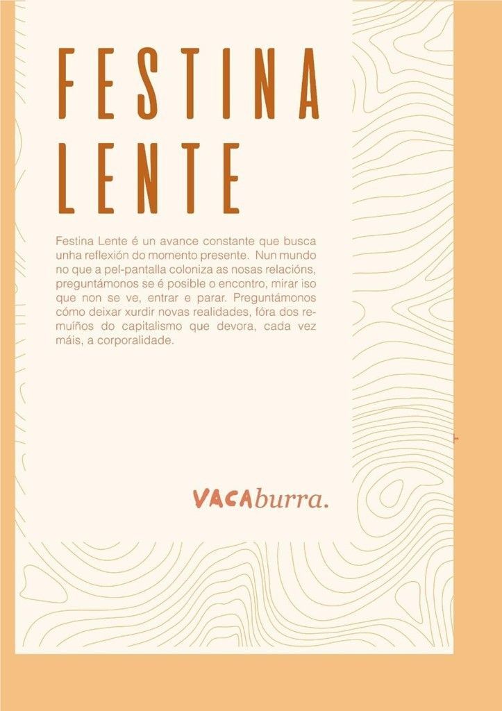 Festina lente, que podrá verse en la Sala Ártika del viernes 3 al domingo 5, a las 20,00 h., es el cuarto montaje de VACAburra, proyecto en común de las creadoras Andrea Quintana y Gena Baamonde. El colectivo debutó con O raro é que bailar sexa raro, a la que siguió metodoloxías carroñeras, y acaba de estrenar, asimismo, la pieza de calle Extravíos, junto a Ukestra do Medio, en el marco del programa de la Xunta Propulsa+Danza+Paisaxe+Patrimonio.